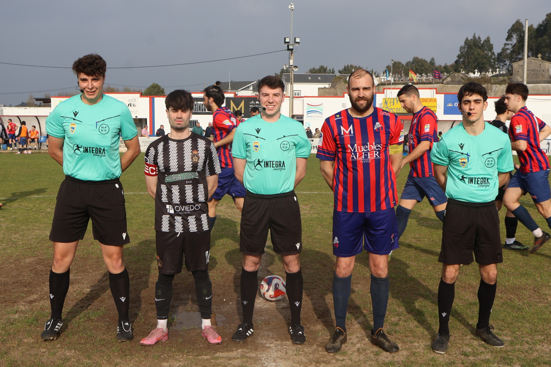 Trío arbitral y capitanes en el encuentro entre Andés y Comercial. Foto de Ángel González.
